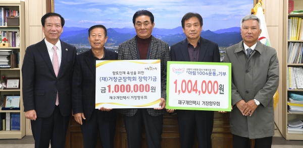[금요저널] 거창군장학회는 21일 재구개인택시 거창향우회가 장학금 100만원과 아림1004운동 후원금 100만 4,000원, 박현보 거창80번택시 대표이사가 장학금 300만원, 거창오리영농회가 장학금 300만원을 각각 기탁했다고 밝혔다.