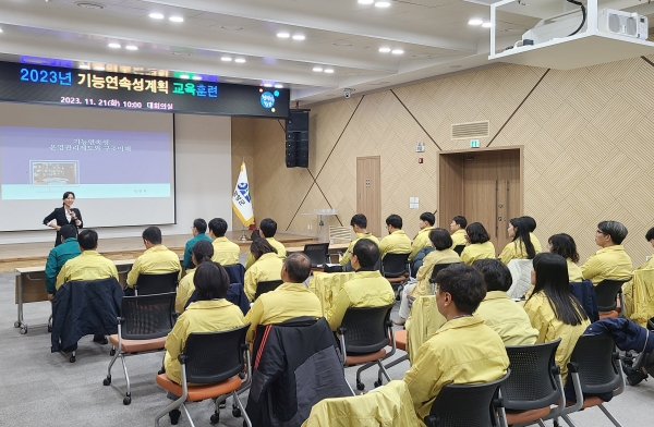 이날 교육은 핵심 기능을 수행하고 있는 50여명의 직원이 참석한 가운데 전문강사의 강의 및 훈련지도로 진행됐으며 기능연속성계획의 기초부터, 화재, 지진으로 인한 청사 붕괴 상황 등 재난시 비상 대응 절차와 역할 점검, 개선방안 도출까지 폭넓게 진행됐다.