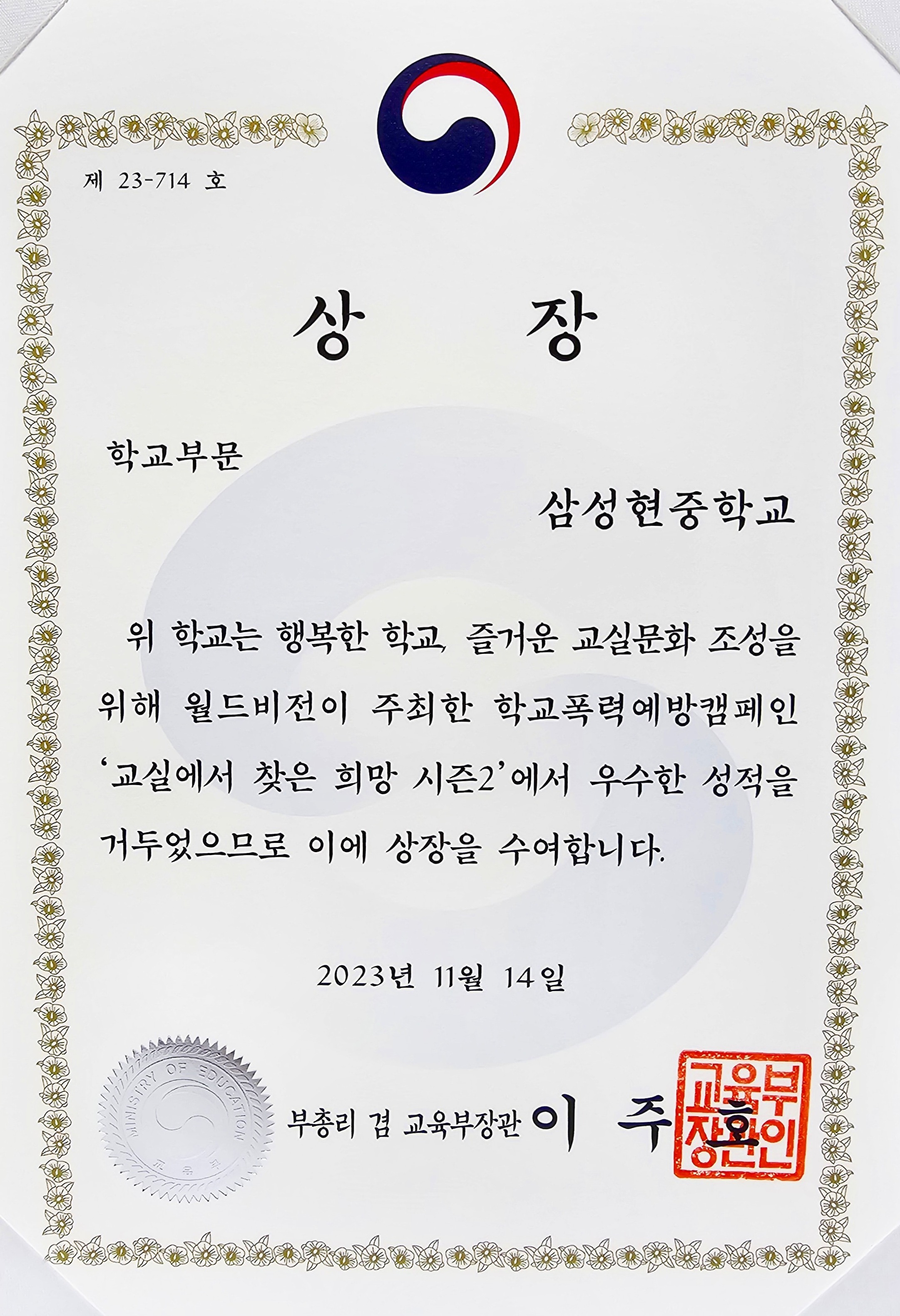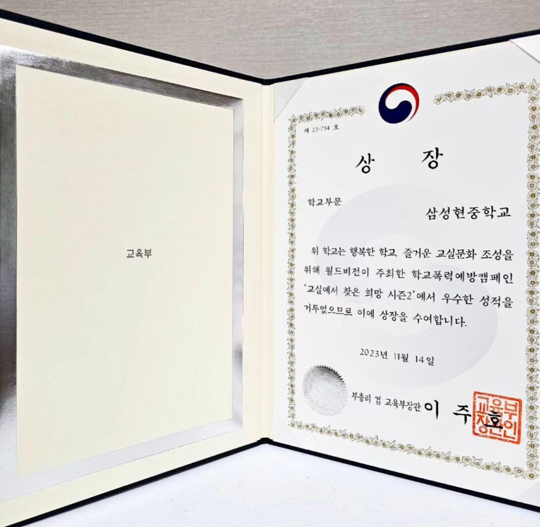 삼성현중학교(교장 이정미)는 월드비전에서 주최한 학교폭력예방캠페인 '교실에서 찾은 희망'에 참여하여 '학교 부문 전국 1위 부총리 겸 교육부장관상'을 수상하며 우수학교로 선정되었다.