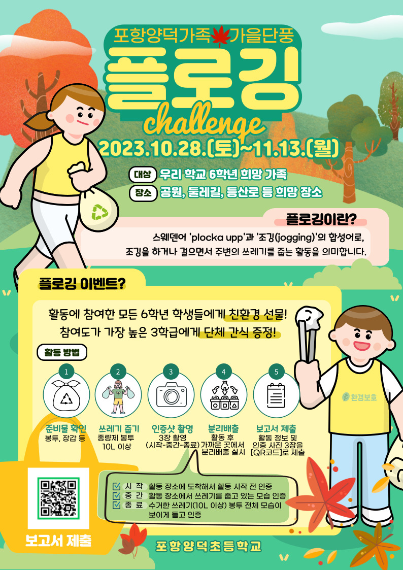 포항양덕초등학교(교장 권택진)는 10월 28일(토)~11월 13일(월) 까지 6학년 학생을 대상으로 가족과 함께하는‘가을 단풍 플로깅’행사를 실시하였다.