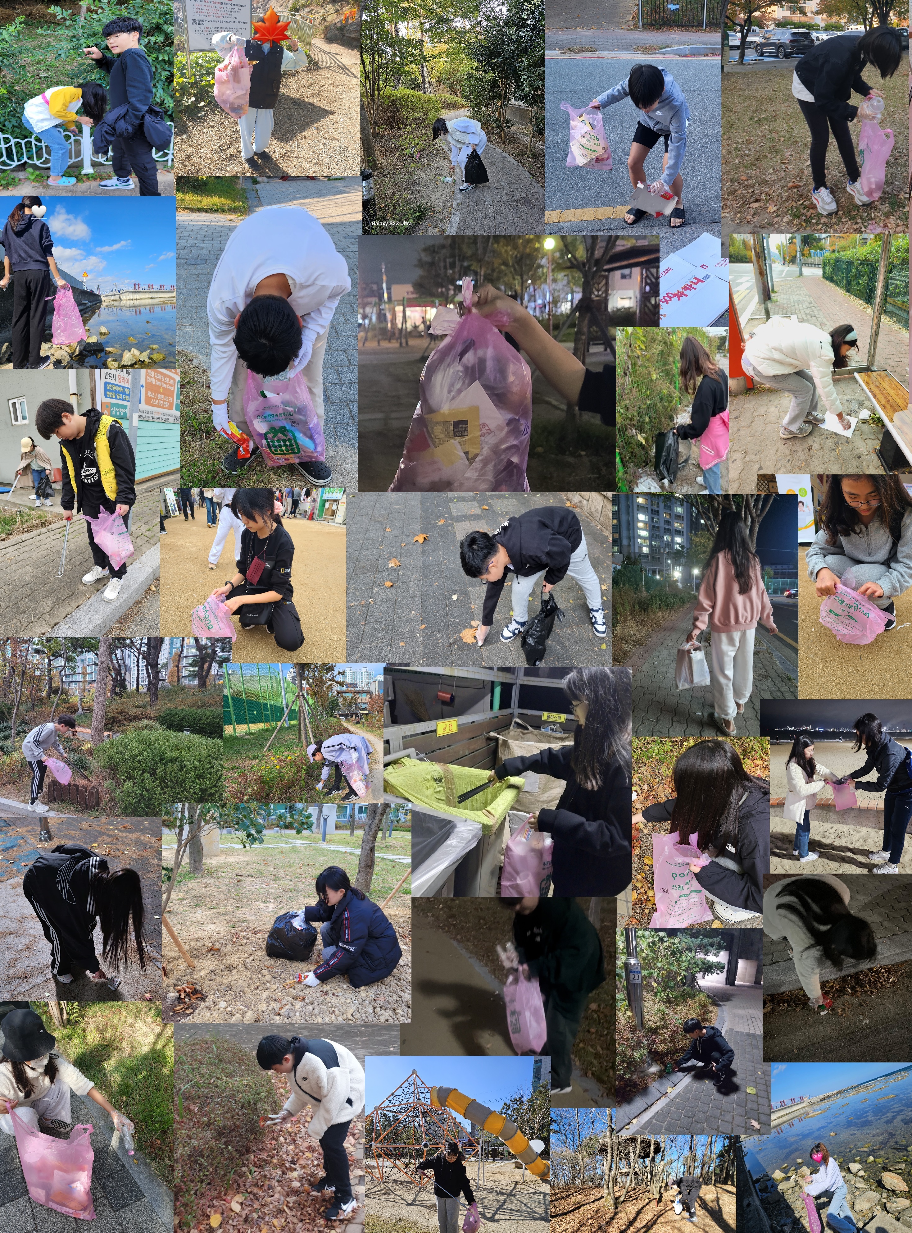 ‘가을 단풍 플로깅’행사는 봉사활동 프로그램의 일환으로 가족과 함께 공원, 둘레길, 등산로 등 희망 장소에서 쓰레기를 주운 후 결과를 인증 사진을 찍어서 담당교사에게 보내는 것이다. 학생들의 참여도를 높이기 위해 참여 학생 모두에게 친환경 선물과 우수 학급에게는 단체로 상품을 받을 수 있는 기회를 주어 큰 호응을 받았다.