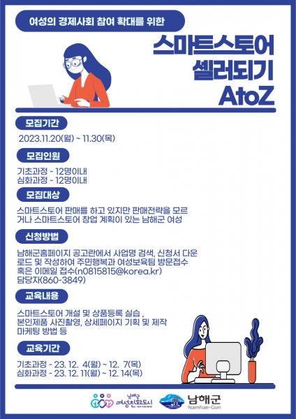 [금요저널] 남해군은 오는 11월 30일까지 여성친화도시 조성 사업의 일환으로 추진하는 ‘스마트스토어 셀러되기 AtoZ 사업’에 함께할 참여자를 모집한다고 밝혔다.