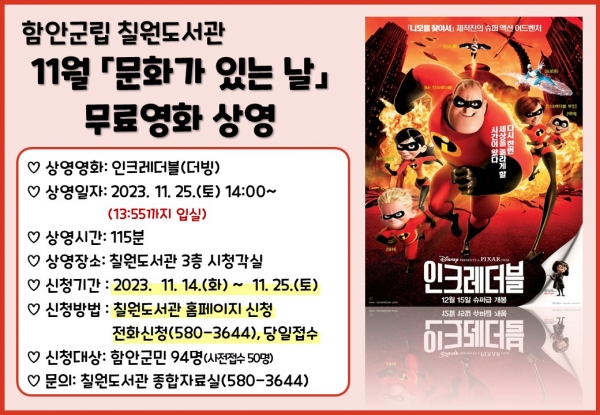 [금요저널] 함안군립 칠원도서관은 오는 25일 토요일 오후 2시, 3층 시청각실에서 애니메이션 영화 ‘인크레더블’을 무료로 상영한다.