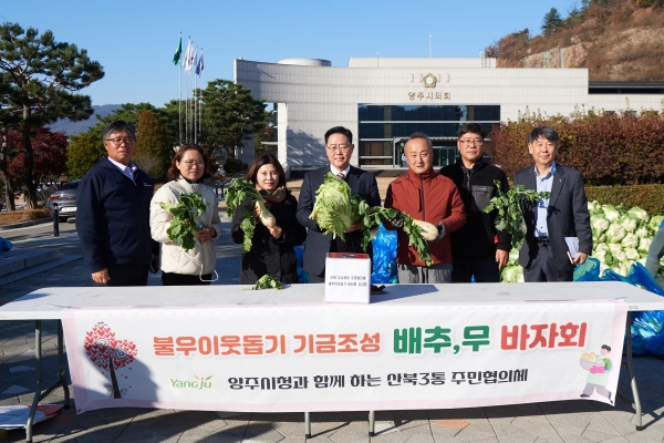 해당 성금은 지난 11일과 13일 총 2회에 걸쳐 산북 3통 마을회관과 양주시청에서 각각 진행된 바자회를 통해 산북 도시재생 주민협의체가 직접 재배하고 수확한 배추 1,200포기와 무 600개를 판매해 마련했다.