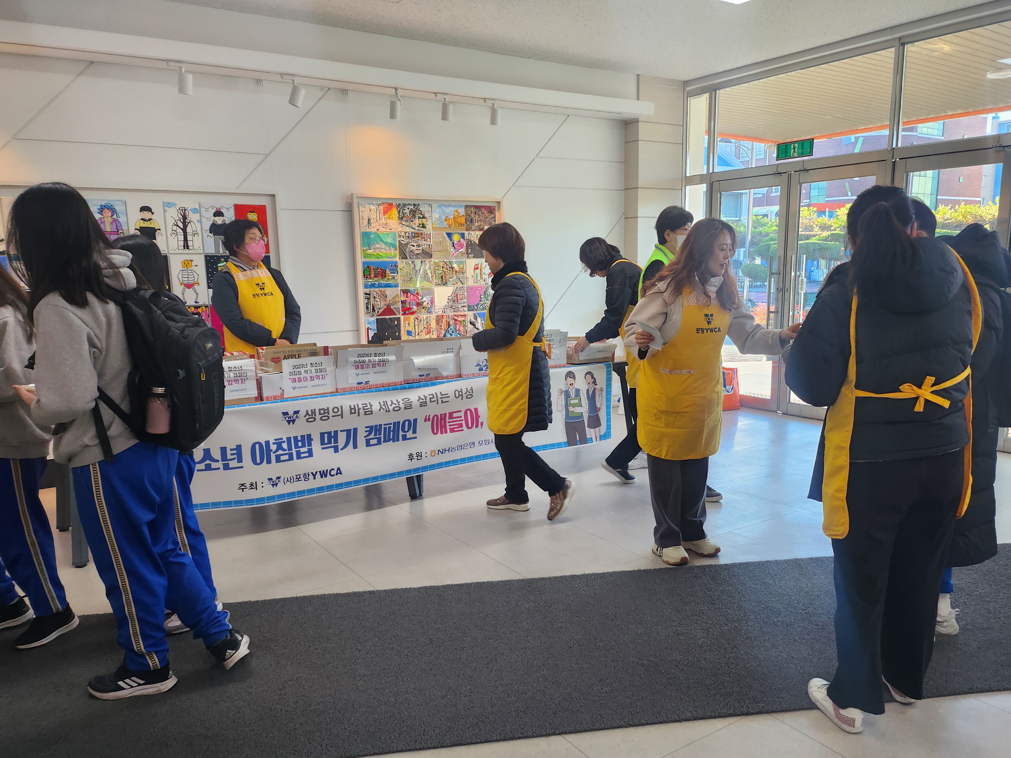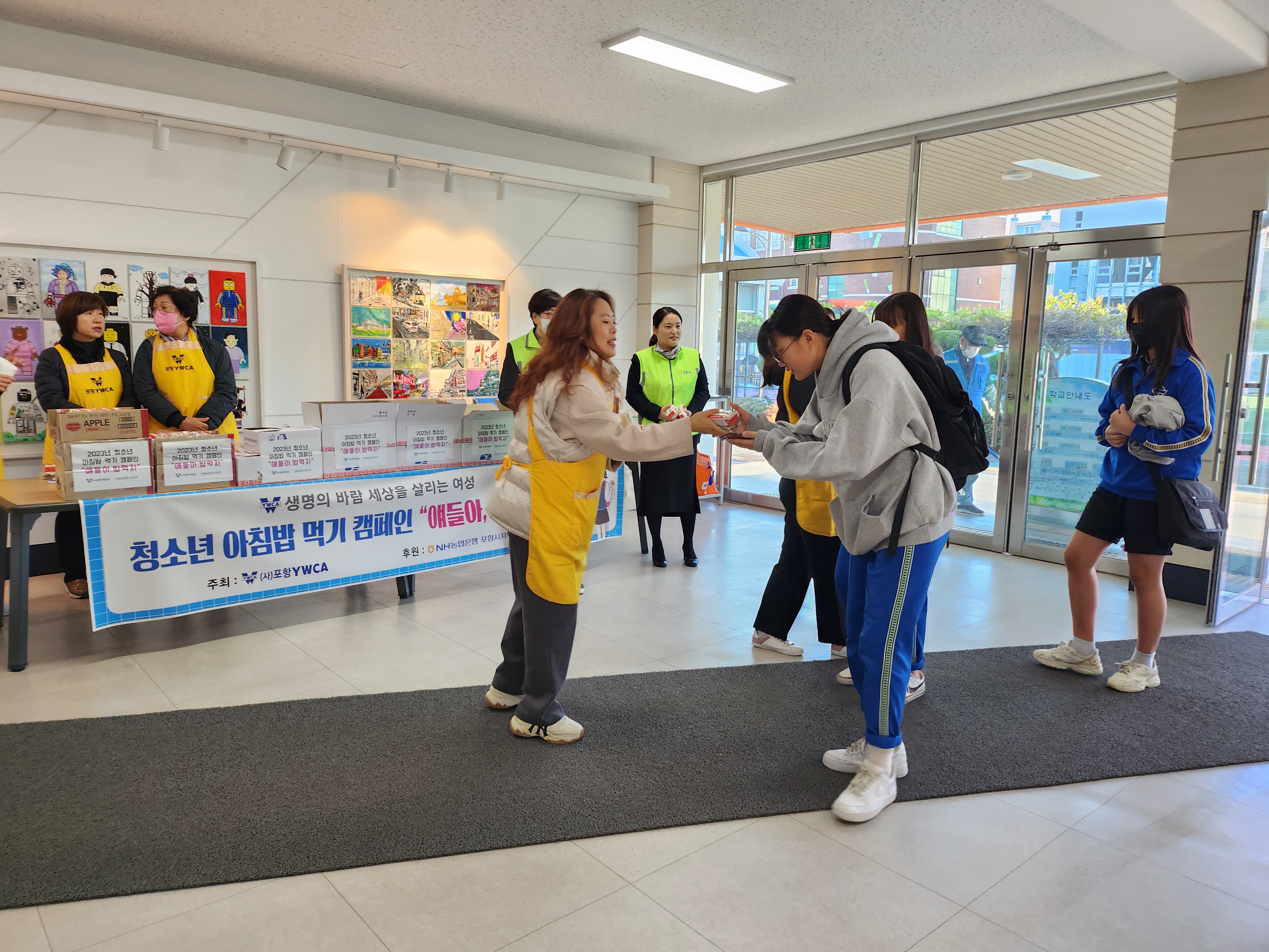 - 포항YWCA, NH농협 포항시지부 임직원들과 함께 우리 쌀로 만든 떡과 음료를 학생들에게 직접 전달하면서 등교하는 학생들을 응원하고 아침밥의 중요성을 알렸다.
