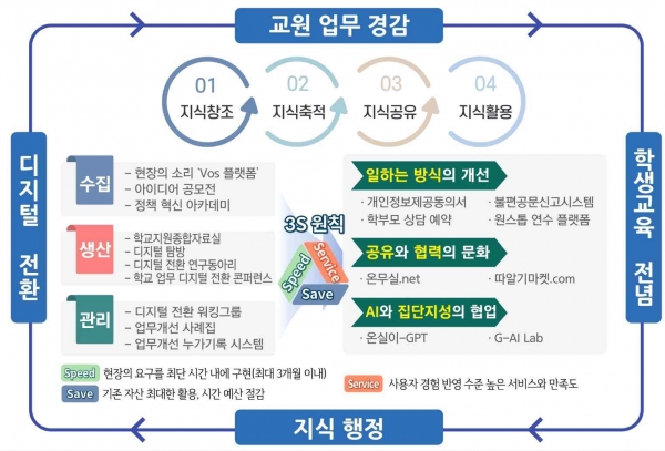또한, 원활한 사업 추진을 위해 세부적으로 ‘학교 업무 디지털’ 혁신 사업을 위해 업무 전산화와 자동화시스템 구축 클라우드 기반 온라인 교무실의 네트워크인 ‘온무실.net’ 운영 교직원을 위해 특화된 나눔 사이트인 ‘따알기 마켓.com’ 구축 등을 통해 협력과 나눔의 문화를 형성했다.
