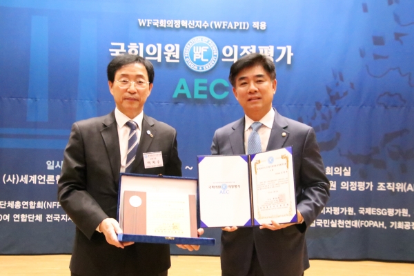 더불어민주당 김병욱 국회의원은 22일 세계청년리더총연맹 부설 국회의원 의정평가 조직위가 주최한 ‘제2회 WFPL 21대 국회의원 300인 의정평가 최종결과 대국민보고회 및 시상식’에서 ‘의정평가 대상’을 수여받았다.