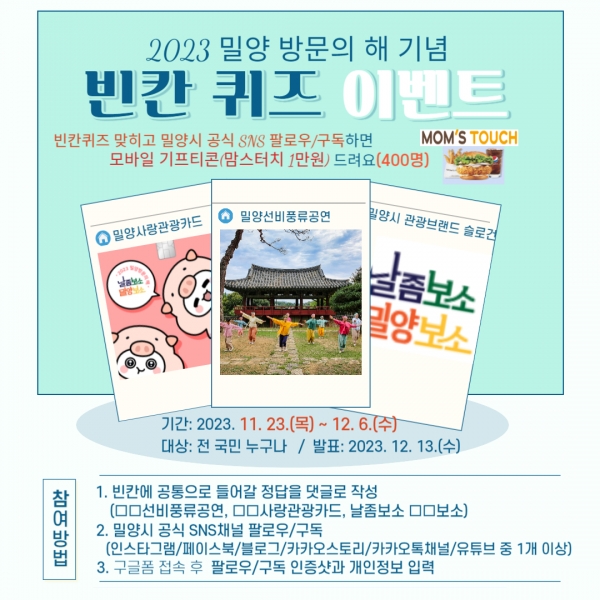 [금요저널] 밀양시는 23일부터 오는 12월 6일까지 밀양시 공식 SNS 채널을 통해 ‘2023 밀양 방문의 해’를 기념한 빈칸 퀴즈 이벤트를 개최한다.