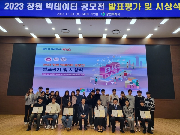 [금요저널] 창원특례시는 공공데이터를 활용한 각종 정책 아이디어 수집과 빅데이터 분석 사업의 분위기 확산을 위해 전국 대학생을 대상으로 실시한 ‘2023 창원 빅데이터 공모전’ 우수작의 발표평가 및 시상식을 23일 창원시청 시민 홀에서 개최했다.