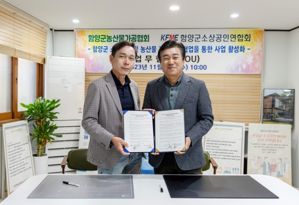 [금요저널] 함양군농산물가공협회와 함양군소상공인연합회는 지난 22일 함양군소상공인지원센터에서 함양군 소상공인 및 농산물 가공업체들의 지원을 활성화하기 위한 업무협약을 체결했다.