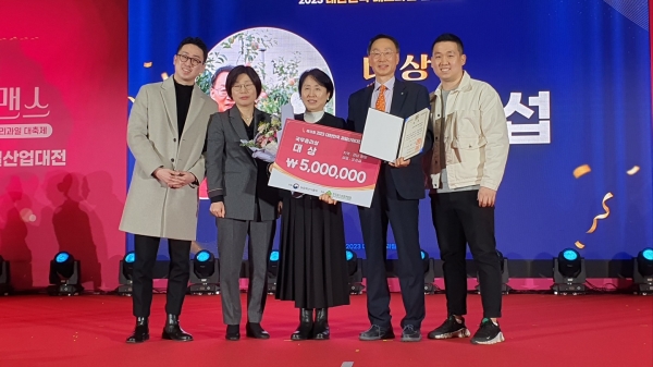 대상을 받은 에덴동산 오성섭 농가는 서하면에서 사과를 재배하던 선친의 뒤를 이어 15년 전부터 농장을 운영했고 현재 사과 2.5ha, 연 40여 톤의 사과를 생산하고 농산물 가공, 교육, 체험 등을 통해 연간 5억여 원의 소득을 창출하고 있다.