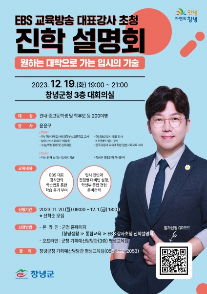 ‘EBS 대표강사 초청 진학 설명회’는 관내 중고등학생과 학부모를 대상으로 12월 19일 오후 7시 창녕군청 3층 대회의실에서 진행된다.