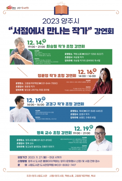 [금요저널] 양주시는 오는 12월 관내 독서문화 진흥을 위해 공공도서관과 지역 서점 4개소와 연계해서 마련한 ‘2023년 양주시 서점에서 만나는 작가 초청 강연회’의 참여자를 선착순 모집한다고 27일 밝혔다.