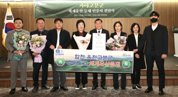 [금요저널] 합천군은 27일 서울 코리아나호텔에서 문화재청 주최로 열린 ‘가야고분군 세계유산 등재 인증서 전달식’에서 합천 옥전고분군 세계유산 등재 인증서를 받았다.