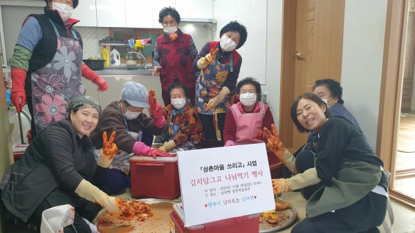 ‘상촌마을 쓰리고’는 마을주민인 윤미소 강사를 필두로 마을주민들이 웃음치료를 기본으로 놀이, 건강체조, 노래교실, 미술교실 등을 주체적으로 운영하는 사업이며 이번 마무리 프로그램은 사업에 참여 중인 어르신들 15명이 모여 ‘김장김치를 담그고 나눠 먹는 행사’로 진행됐다.