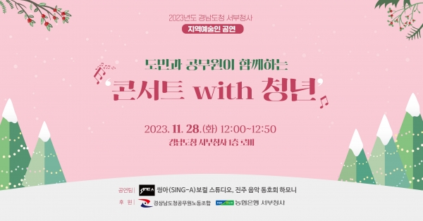 [금요저널] 경남도는 오는 11월 28일 낮 12시 경남도청 서부청사 1층에서 진주 지역청년 음악인 2개팀보컬스튜디오)를 초청해 ‘콘서트with청년’라는 주제로 공연을 개최할 예정이다.