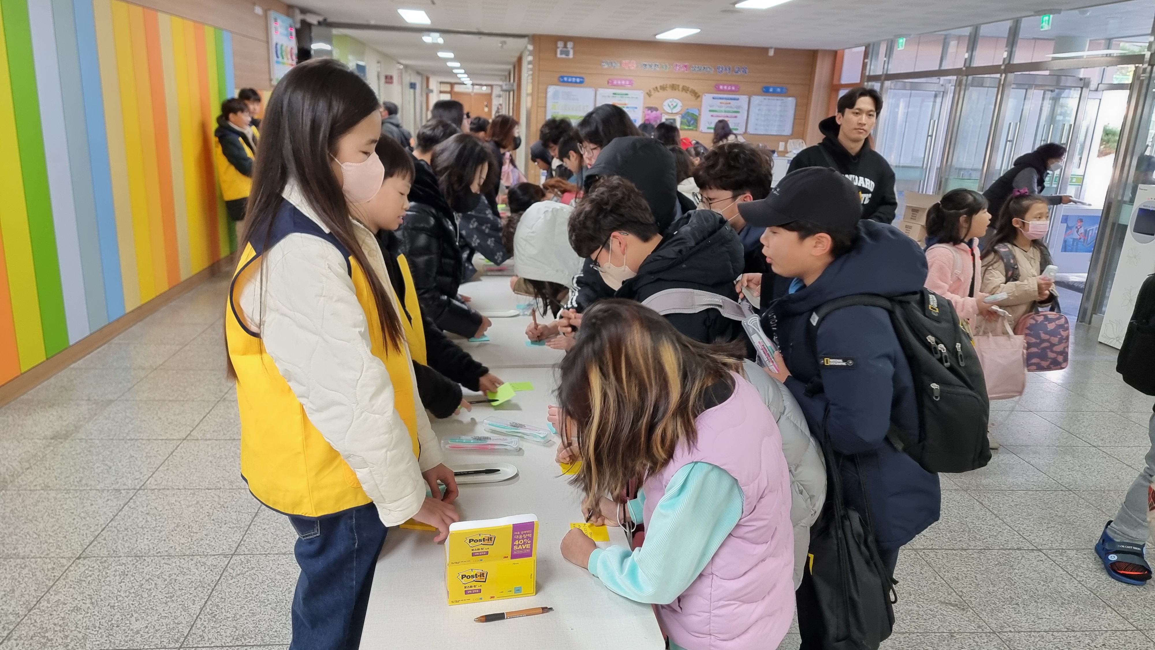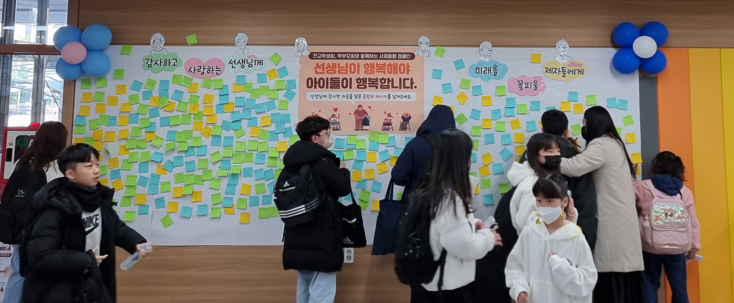 이날 캠페인은 학부모회에서 기획한 행사로 ‘선생님들이 행복하면 아이들도 행복하다’는 슬로건을 내걸고 학생들은 선생님들께 감사하고 사랑하는 마음을, 선생님은 미래를 꽃피울 제자들에게 응원의 메시지를 전하는 시간을 가졌다. 또한 학부모회에서 준비한 사제존중 칫솔세트를 학생들에게 나누어줘 더욱 뜻깊은 시간이었다.