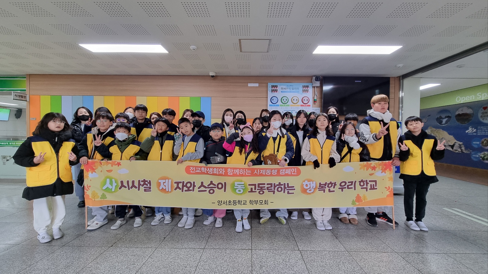 정승욱 교장은 “캠페인에 참여한 학부모회 회원님들께 감사드리며 사시사철 제자와 스승이 동고동락하는 행복한 양서초등학교를 만들 것이다. 앞으로도 학부모회 활동에 더욱 관심을 가지고 적극적으로 지원하여 학부모와 함께하는 교육공동체가 되도록 노력하겠다.”고 전했다.