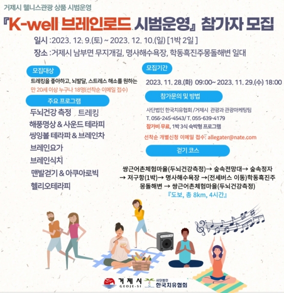 [금요저널] 거제시는 건강 및 항노화에 대한 관심증가와 웰니스중심의 체험관광 트렌드 변화에 발맞추기 위해 개발된 웰니스관광상품‘K-well 브레인로드’시범운영 참가자를 오는 28일부터 29일까지 모집한다고 밝혔다.