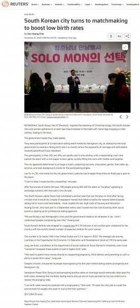 [금요저널] 성남시의 미혼 청춘남녀 만남 행사인 ‘솔로몬의 선택’이 27일 세계적 통신사인 로이터에서도 보도됐다.