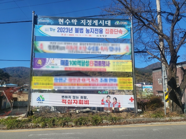 [금요저널] 함양군은 코로나19 이후 상업용 현수막 수요가 증가함에 따라 오는 12월부터 현수막 지정 게시대 게시 기간을 15일에서 10일로 조정한다고 밝혔다.