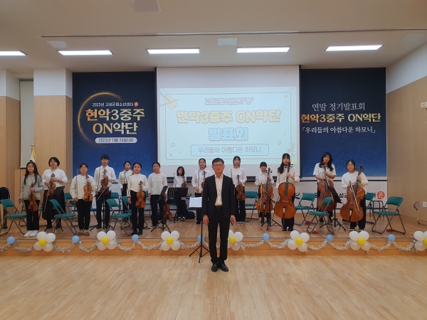 [금요저널] 고성군청소년센터“온”은 11월 24일 모이자홀에서 2023년 현악3중주-ON악단 연말 정기발표회 ‘우리들의 아름다운 하모니’를 성황리에 개최했다고 밝혔다.