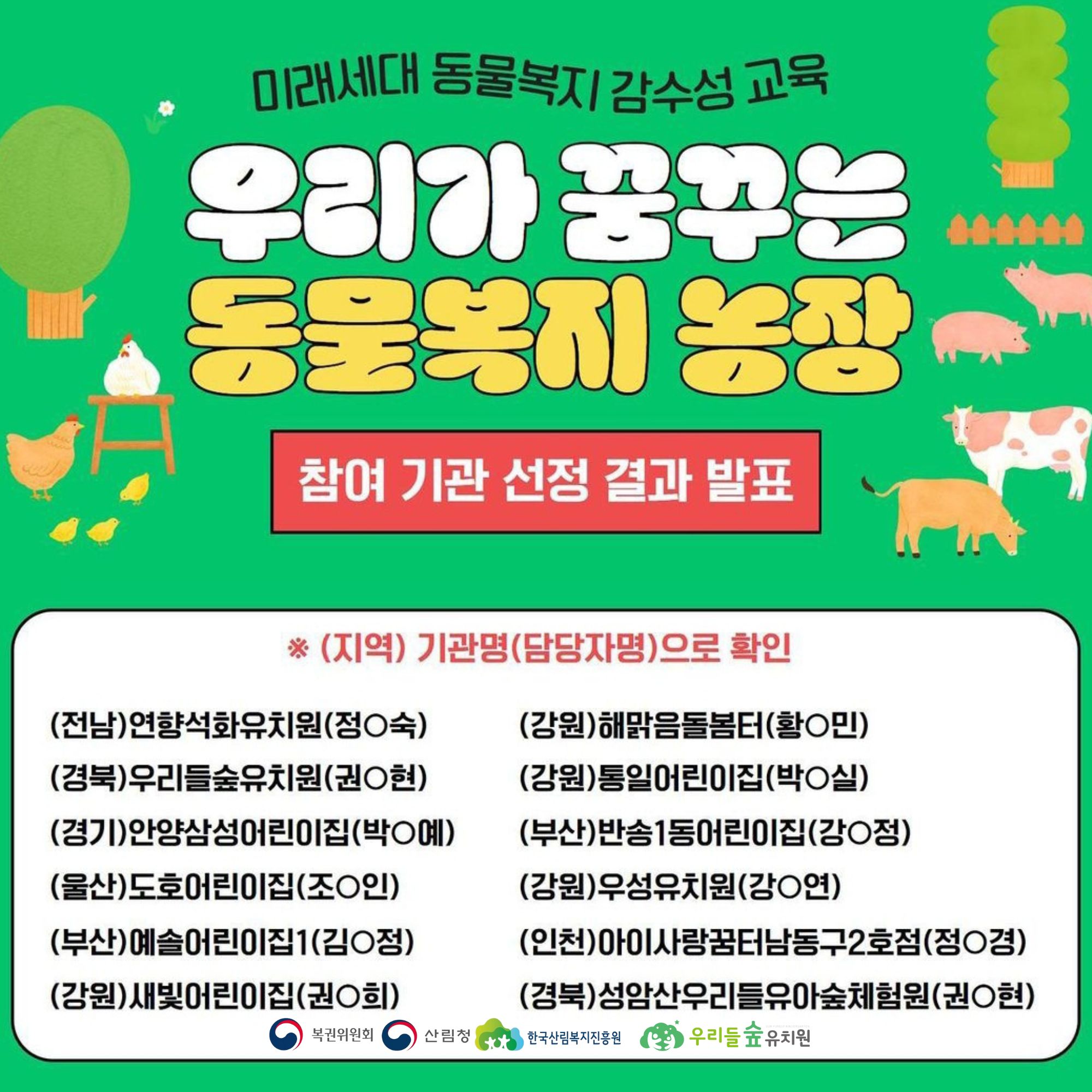 우리들숲유치원(원장 송옥화)과 우리들숲학교(대표 신소선)은 2023년 11월 23일(목), 우리들숲유치원 및 우리들숲학교의 전체 유아대상으로 미래세대 동물복지 감수성 교육 ‘우리가 꿈꾸는 동물복지 농장’ 공모 사업에 선정이 되었습니다.