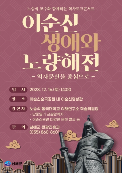 [금요저널] 남해군이 오는 12월 16일 이순신 순국공원에서 ‘이순신의 생애와 노량해전’이라는 주제로 토크콘서트를 개최한다.