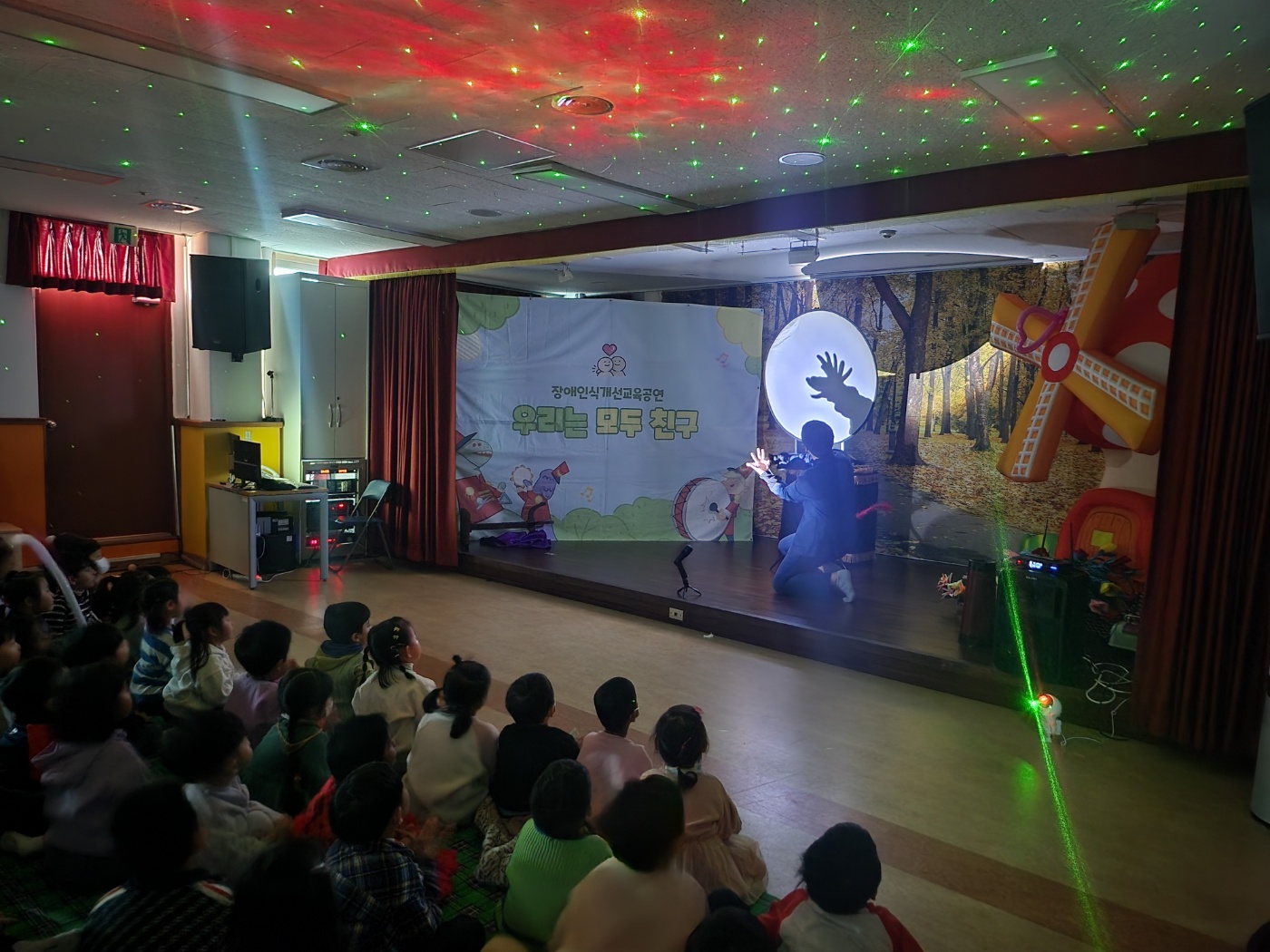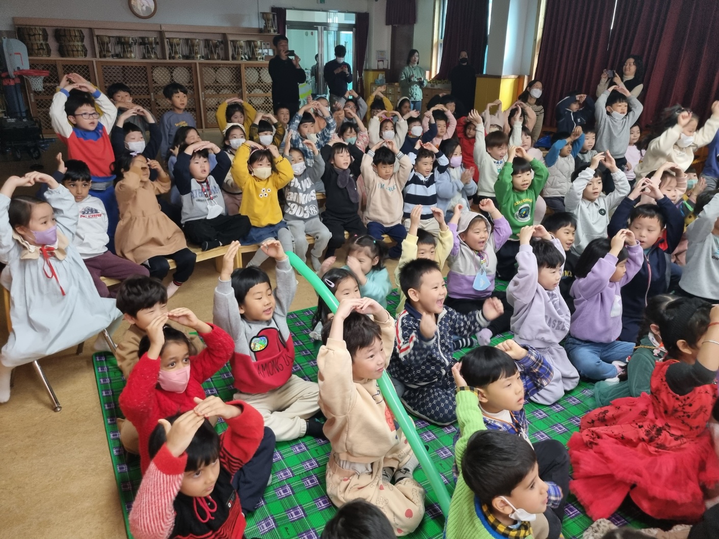 □ 교실에서 사전 활동으로 몸이 불편한 친구들을 돕는 방법, 함께 놀이하는 방법 등에 대해 영상 시청 후 이야기 나눈 뒤, 강당으로 이동하여 본격적으로 유아들과 함께 O, X 퀴즈 풀기, 다양한 풍선 공연 관람, 시·청각장애인의 불편함을 간접적으로 체험하는 마술 공연 관람 등 일반적인 교육과는 다르게 신나는 분위기의 장애인식개선교육을 하였다.
