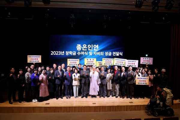 [금요저널] 김해시 장유2동 소재 장유사 사회복지 나눔 단체 ‘좋은 인연 ’은 지난 29일 남명아트홀에서 2023년 장학금 수여식 및 자비의 성금 전달식을 개최했다고 30일 밝혔다 좋은 인연은 2011년 ‘모두가 더불어 행복한 세상’을 만들자는 취지하에 뜻있는 30여명의 회원으로 창립되어 2023년 현재 800여명의 후원회원이 활동하고 있다.