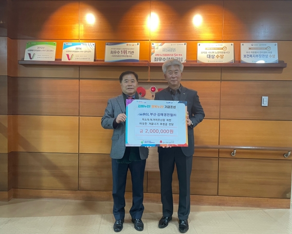 [금요저널] 김해시복지재단 김해시노인종합복지관은 부산·김해경전철㈜에서 취약계층의 안전하고 따듯한 겨울나기를 지원하기 위한 후원금을 29일 기탁했다고 밝혔다.