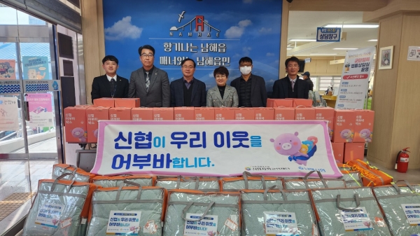 [금요저널] 남해신용협동조합은 29일 남해읍행정복지센터를 방문해 관내 저소득층 및 소외된 이웃을 위해 써달라며 300만원 상당의 겨울이불 20채와 생필품으로 구성된 어부바박스 40개를 기탁했다.