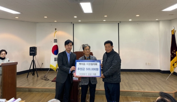 이원용 회장은 “한파가 기승을 부리는 요즘 주변에 힘든 어르신들이 많은 것 같다”며 “이번 기부로 백석읍 관내 어르신들에게 따뜻한 온기가 전해지길 바라고 앞으로도 백석읍의 발전을 위해 이장협의회가 적극 노력하겠다”고 밝혔다.