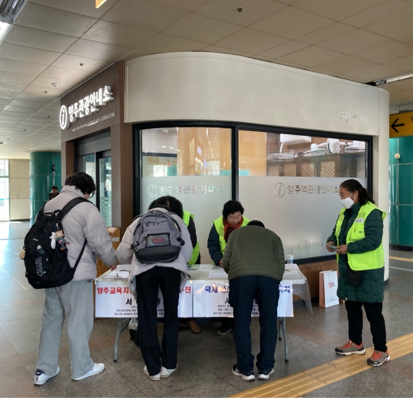 행사 첫날 참여한 양주1동 주민자치위원회 위원들은 양주역을 이용하는 시민들에게 양주교육지원청 신설과 국제스피트스케이트장 유치에 대한 적극적인 관심을 유도하며 서명운동 동참을 적극 이끌어냈다.
