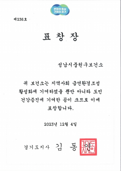 [금요저널] 성남시는 중원구보건소가 ‘2023년 경기도 통합건강증진·금연사업 합동 성과대회’에서 지역사회 금연 분야의 성과를 인정받아 도지사 표창을 받았다고 7일 밝혔다.