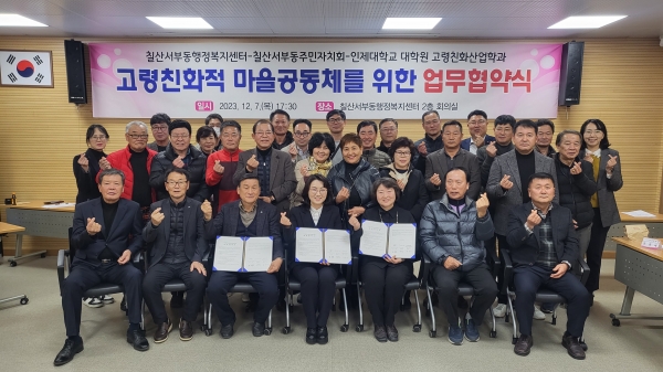 협약식에는 칠산서부동행정복지센터, 칠산서부동주민자치회, 인제대학교 대학원 고령친화산업학과의 대표가 참석해 칠산서부동 고령자 삶의 질 향상을 위해 상호간 긴밀하게 협력관계를 유지한다는 협약서에 서명했다.