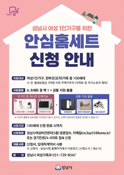 [금요저널] 성남시는 여성 1인 가구 100명에 안심홈세트를 지원한다고 11일 밝혔다.