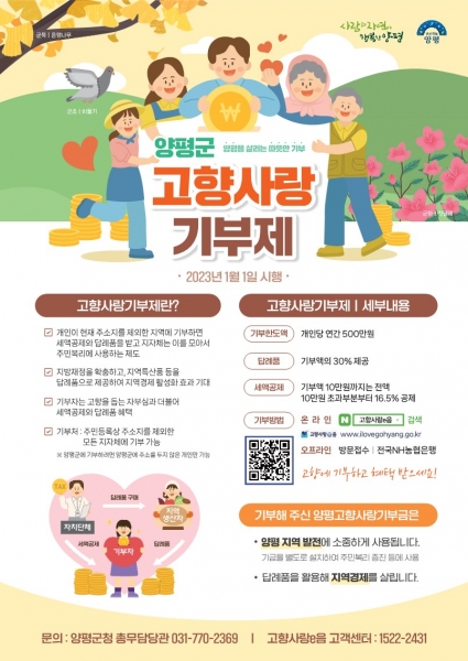 전진선 양평군수는 “고향사랑기부제를 통해 양평군에 응원을 보내주신 모든 분께 감사드린다”며 “기부금을 통해 기금사업을 적극 발굴하고 ‘사람과 자연 행복한 양평’을 만들기 위해 지속해서 노력하겠다”고 전했다.