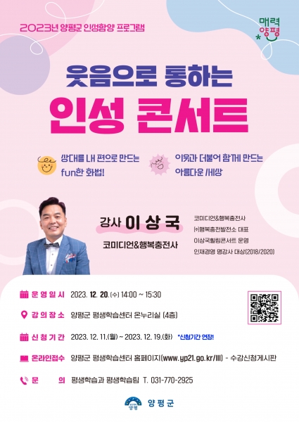 [금요저널] 양평군은 인성함양 프로그램 ‘웃음으로 통하는 인성 콘서트’를 오는 20일 오후 2시 평생학습센터 4층 온누리실에서 개최한다고 밝혔다.