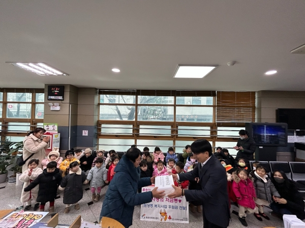 어린이집 원아들이 모은 소중한 모금액을 전달하며 장미숙 꿀송이 어린이집 원장은 “아이들이 고사리 같은 손으로 소중하게 모은 저금통 모금액이 관내 도움이 필요한 어려운 이웃을 위해 좋은 일에 쓰이길 바란다”는 뜻을 전했다.