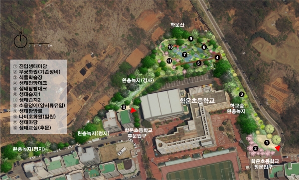 학운리 완충녹지는 학운산 주연부 불법경작 등으로 훼손이 심했는데 국비 4억3천만원을 투입해 훼손된 숲을 복원하고 용출수로 인해 상시 습한 지점을 생태습지로 조성해 생태탐방로 식물학습장 생태전망대 관찰데크 등을 2024년 10월말까지 조성한다는 계획이다.