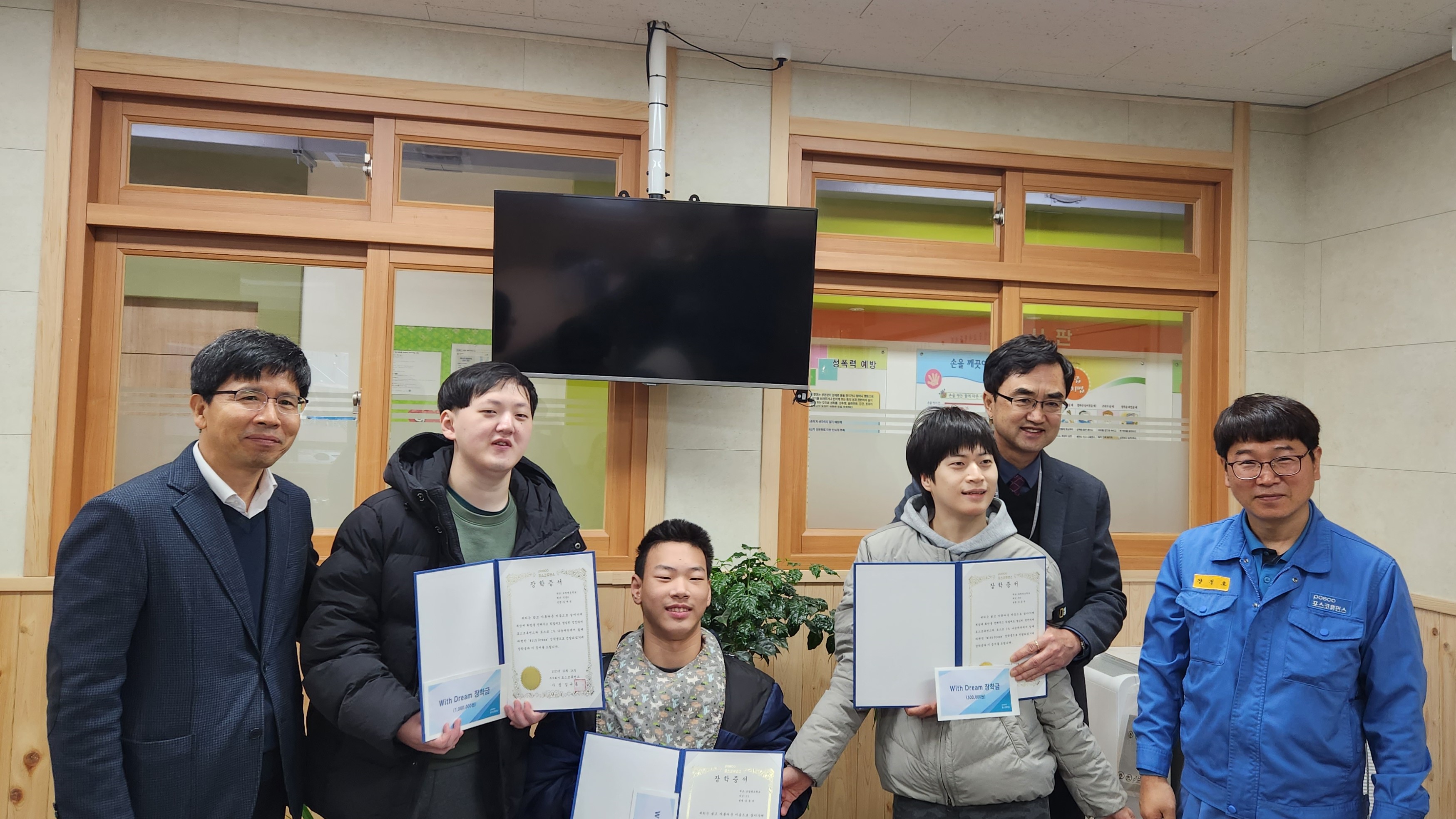 □ ㈜포스코휴먼스(사장 김규홍)는 12월 14일(목) 포항명도학교(교장 김재규)를 방문하여 「With Dream」 장학생으로 선발된 김홍찬(중학 3학년) 50만원, 김동욱(고등 1학년), 김재성(전공 2학년) 학생에게 각각 장학금 100만원과 장학증서를 전달했다.