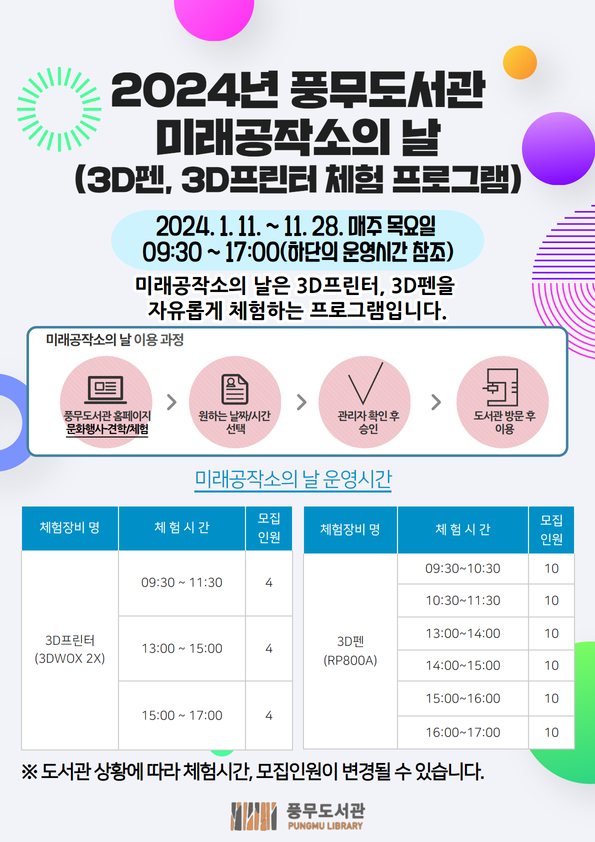 참여 신청은 2023년 12월 26일 화요일 오전 10시부터 풍무도서관 홈페이지의 견학, 체험탭을 통해 온라인 선착순으로 장비를 신청해 사용할 수 있으며 3D프린터의 경우 두 시간, 3D펜의 경우 한 시간 단위로 예약해 이용할 수 있다.