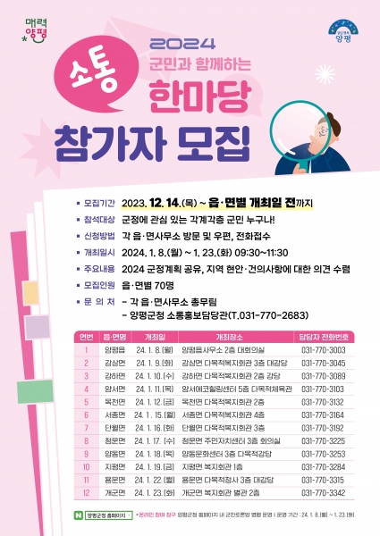 이번 소통한마당은 8일 양평읍을 시작으로 23일 개군면까지 12일간 이어지며 12개 읍면에서 2024년 민선8기 군정 운영 방향과 주요사업 설명, 주민과의 대화를 통한 건의사항과 정책 제안 청취 등 양방향 소통의 장이 펼쳐진다.
