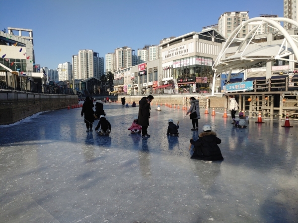 ‘금빛수로 아동 얼음썰매장’은 금빛수로 라베니체 수변무대 인근에서 오전 10:00부터 오후 16:30까지 13세 이하 아동을 대상으로 무료로 운영되고 아이 1명당 보호자 1명까지만 함께 입장할 수 있다.