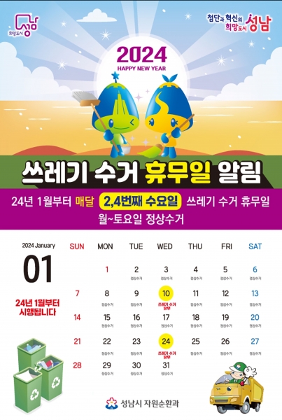 이달 10일부터 수요일 휴무제가 시행돼 1월 24일 2월 7일 2월 21일 등 해당 날짜에는 쓰레기를 수거하지 않는다.