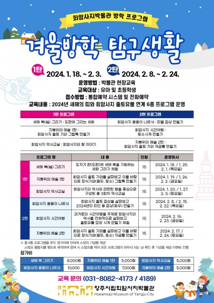 [금요저널] 양주시립회암사지박물관은 오는 18일부터 2월 24일까지 유아 및 초등학생을 대상으로 겨울방학 특별프로그램 ‘겨울방학 탐구생활’을 운영한다고 밝혔다.
