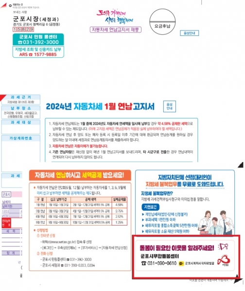 작년에 이어 군포시민에게 부과되는 지방세 연납 납부 고지서에 “돌봄이 필요한 이웃을 알려주세요”라는 문구와 함께 군포시무한돌봄센터 연락처를 노출해 발송함으로써 주변의 복지위기가구 제보를 독려하고 있다.