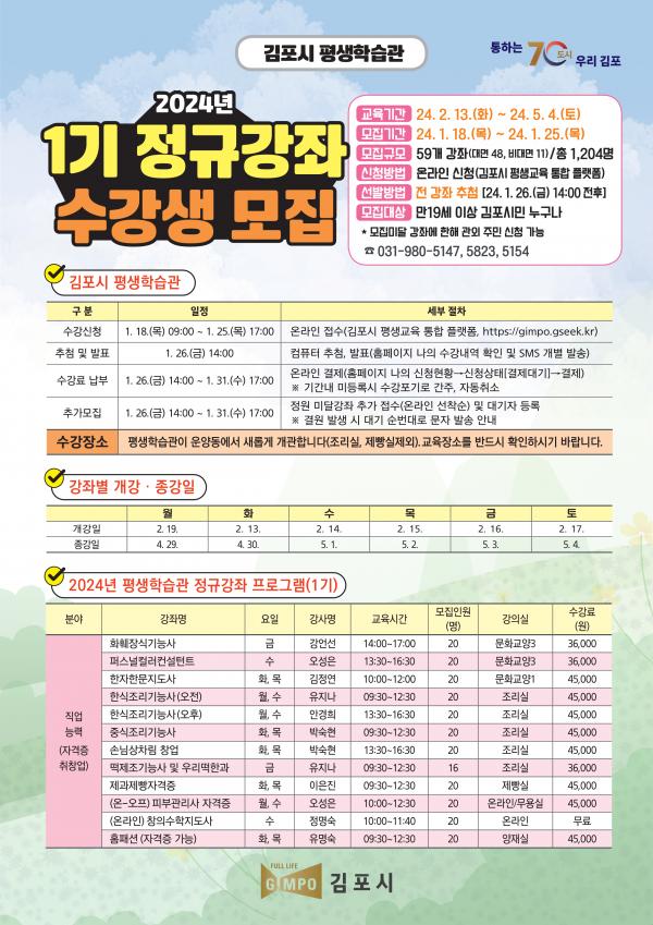 김포시 평생교육 통합 플랫폼에서 모집 강좌 확인 및 신청이 가능하며 모집기간은 1월 18일부터 25일까지, 수강기간은 2월 13일부터 5월 4일까지로 전 강좌 추첨을 통해 수강생을 선발한다.