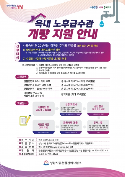 대상자는 신청서 공사 견적서 수질검사 성적서 또는 아연도강관 촬영 사진 등을 성남시청 5층 수도시설과에 직접 내거나 담당부서 이메일로 보내면 된다.